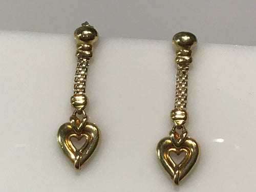 14 K.T.LADIES YELLOW GOLD DANGLE HEART EARRINGS, MESH DESIGN